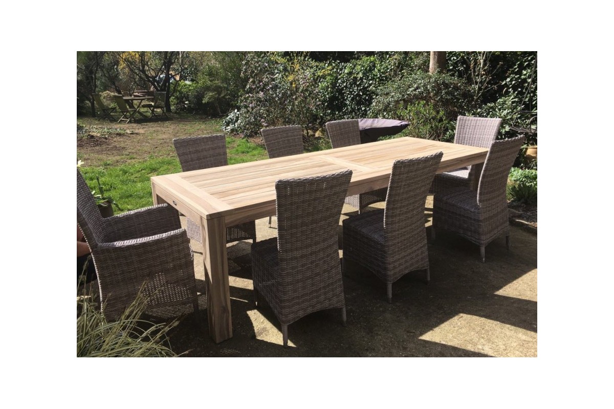 Ensemble table et chaise de jardin teck'attitude salon de jardin en teck ecograde sirocco, table 1.20 à 1,80 m + 6 chaises karimun pour 6 convives dimensions table : Confortables avec leur haut dossier ergonomique et leur coussin écru, les chaises lord composent un ensemble repas au charme intemporel avec une table en teck massif. Achat table et chaise de jardin en resine tressee en ligne. Des fauteuils supplémentaires clea peuvent être rajoutés pour ainsi permettre d'accueillir minimum 4 assises et partager des bons repas en famille ou entre amis. Grâce au rotin synthétique résistant aux intempéries et à l'eau, les chaises longues sont faciles à nettoyer, résistantes et adaptées à un usage quotidien à l'extérieur.
